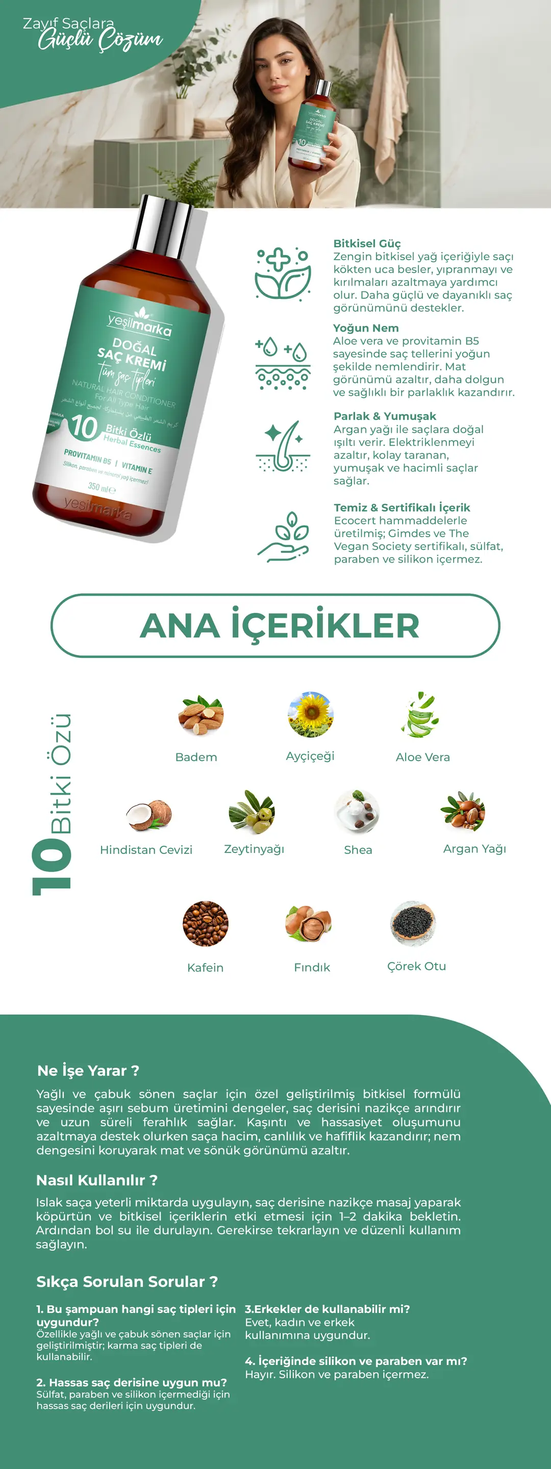 Argan yağı saçlarınıza ekstra parlaklık kazandırır. Aloe vera özü saçınızı derinlemesine nemlendirir. İçeriğindeki provitamin B5 ile saçlarınız daha canlı ve dolgun görünür. İlk kullanımdan itibaren hissedilen ipeksi dokunuş, canlı ve parlak saçlar için on bitki özünün sinerjik etkisiyle saçınıza bitkisel bak Devamını Göster