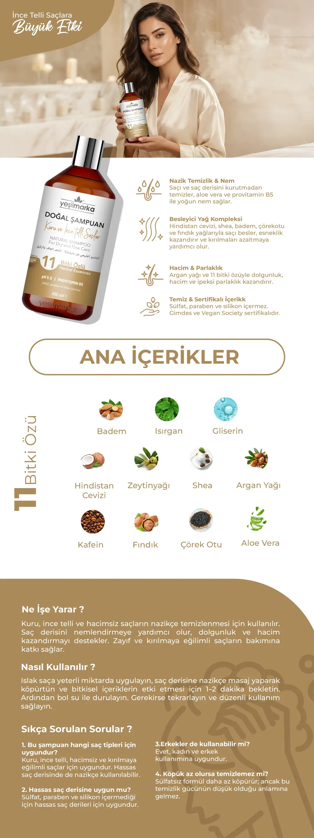 Kuru, ince telli, zayıf ve cansız saçlar için özel olarak geliştirilmiş formülü sayesinde saç ve saç derinizi kurutmadan nazikçe temizlerken saç derisini derinlemesine nemlendirir. Saçınıza dolgunluk ve hacim kazandırmak için formüle edilmiştir.İçeriğindeki hindistan cevizi yağı, shea yağı, tatlı badem yağı, çörekotu yağı, fındık yağı ve ısırgan özü kökten uca saçınızı beslerken, saça esneklik katar, dayanıklılığını arttırır ve kırılmaları önlemeye yardımcı olur.