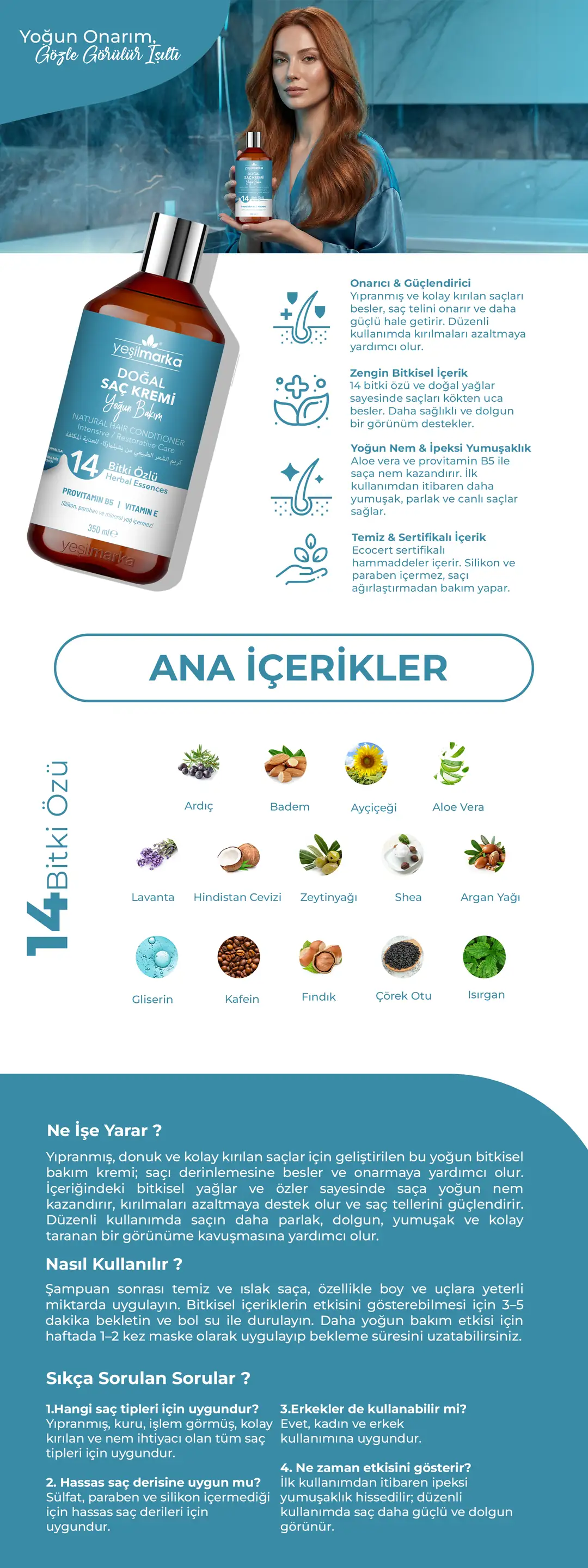 Yıpranmış, donuk ve kolay kırılan saçlara özel geliştirilen saç kremi saçı besler ve onarır. Hafif yapılı formülü saçı dolgunlaştırır ve güçlendirir. İçeriğindeki hindistan cevizi, shea, tatlı badem, fındık, çörekotu, argan, zeytinyağı gibi yağlar, sarımsak ve ısırgan özleriyle saçınızı beslerken, kırılmaları azaltır. Ardıç ve lavanta yağı saç derisi problemlerine karşı savaşır. Aloe vera özü saçınızı nemlendirir. İçeriğindeki provitamin B5 ile saçlarınız canlı ve dolgun görünür.
