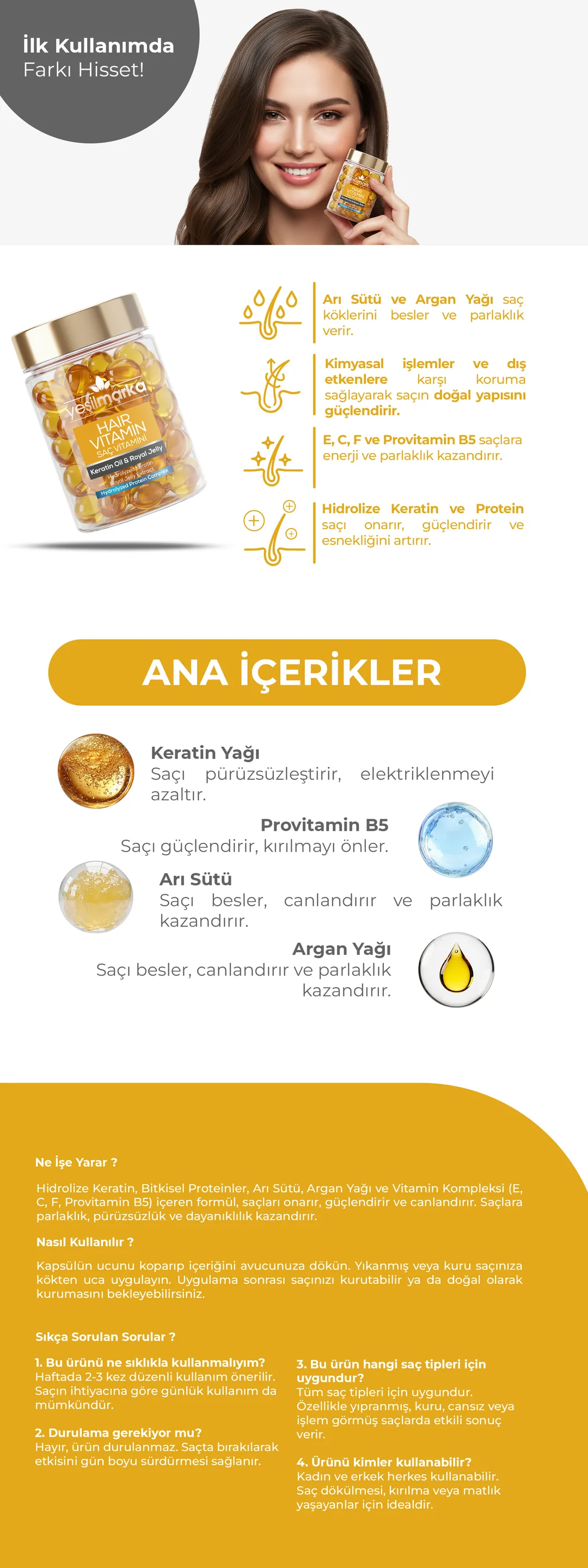 Saçlarınızın ihtiyaç duyduğu lüks ve canlılık artık parmaklarınızın ucunda. Yeşilmarka Saç Vitamini - Keratin Oil & Royal Jelly ile saçlarınıza özel bir bakım yapın ve saçlarınızın yeniden hayat bulmasını sağlayın.