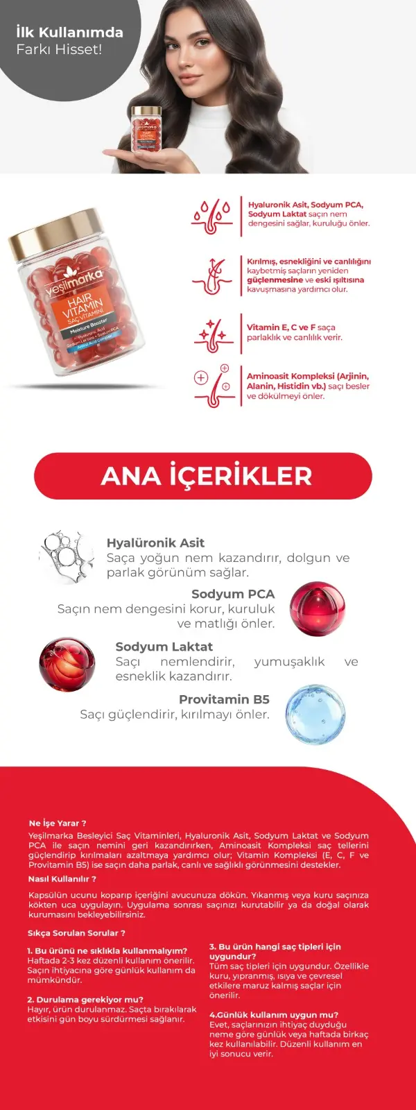 Yeşilmarka Saç Vitamini - Moisture Booster, içeriğinde bulunan üç temel unsur ile saç sağlığınızı destekler: Hyaluronik Asit ve Aminoasit Kompleks. Hyaluronik Asit, saç tellerine kaybettikleri nemi geri kazand Devamını Göster